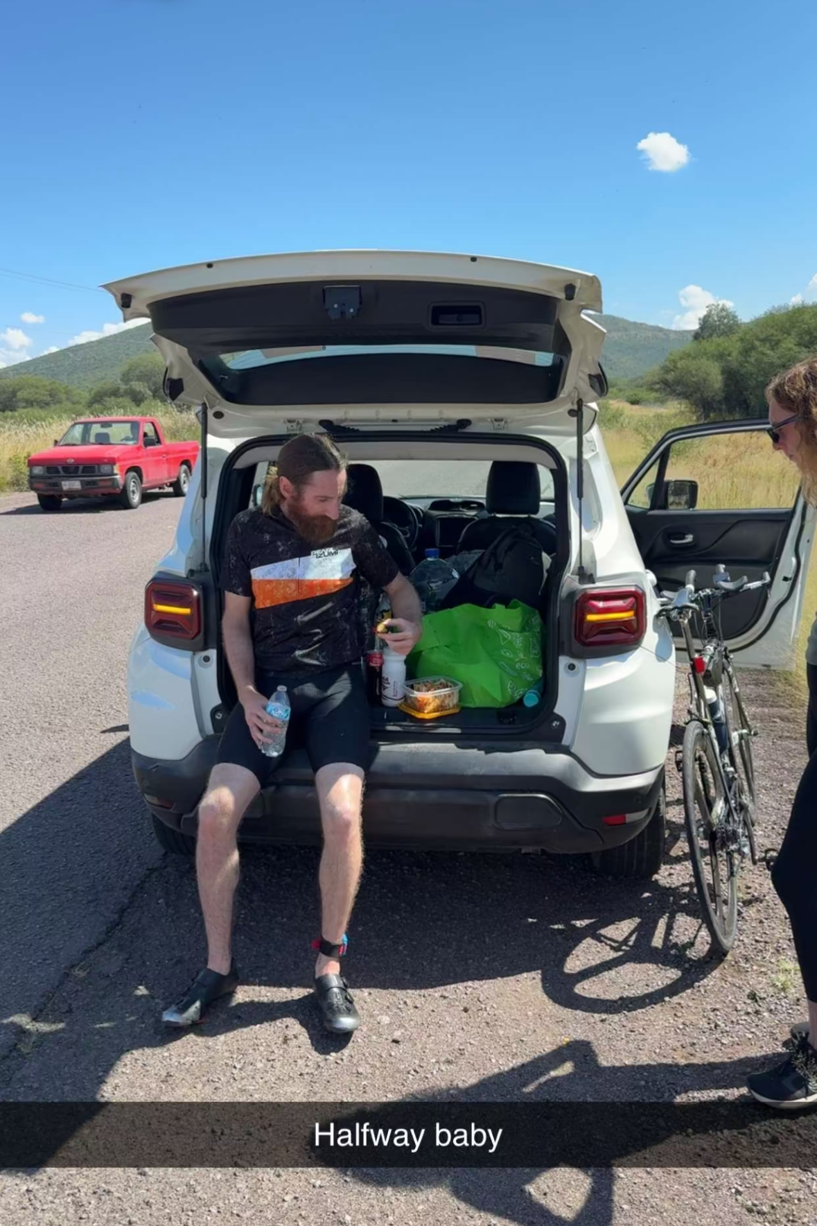 They pulled ahead, parked, and popped the trunk. Multiple cop cars pulled up behind us, and a few people came out from the gas station. I was half clipped in when Korbin grabbed the bike from me and went to work. Renée handled water, food, sunscreen. I sat in the shade of the trunk with a tennis ball against the car, rolling out my right QL, eating, drinking, trying to reset.